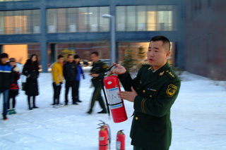 讲座后,参加学习人员在消防官兵的指导下到交通楼空地上进行消防器材操作使用和灭火技能演练。